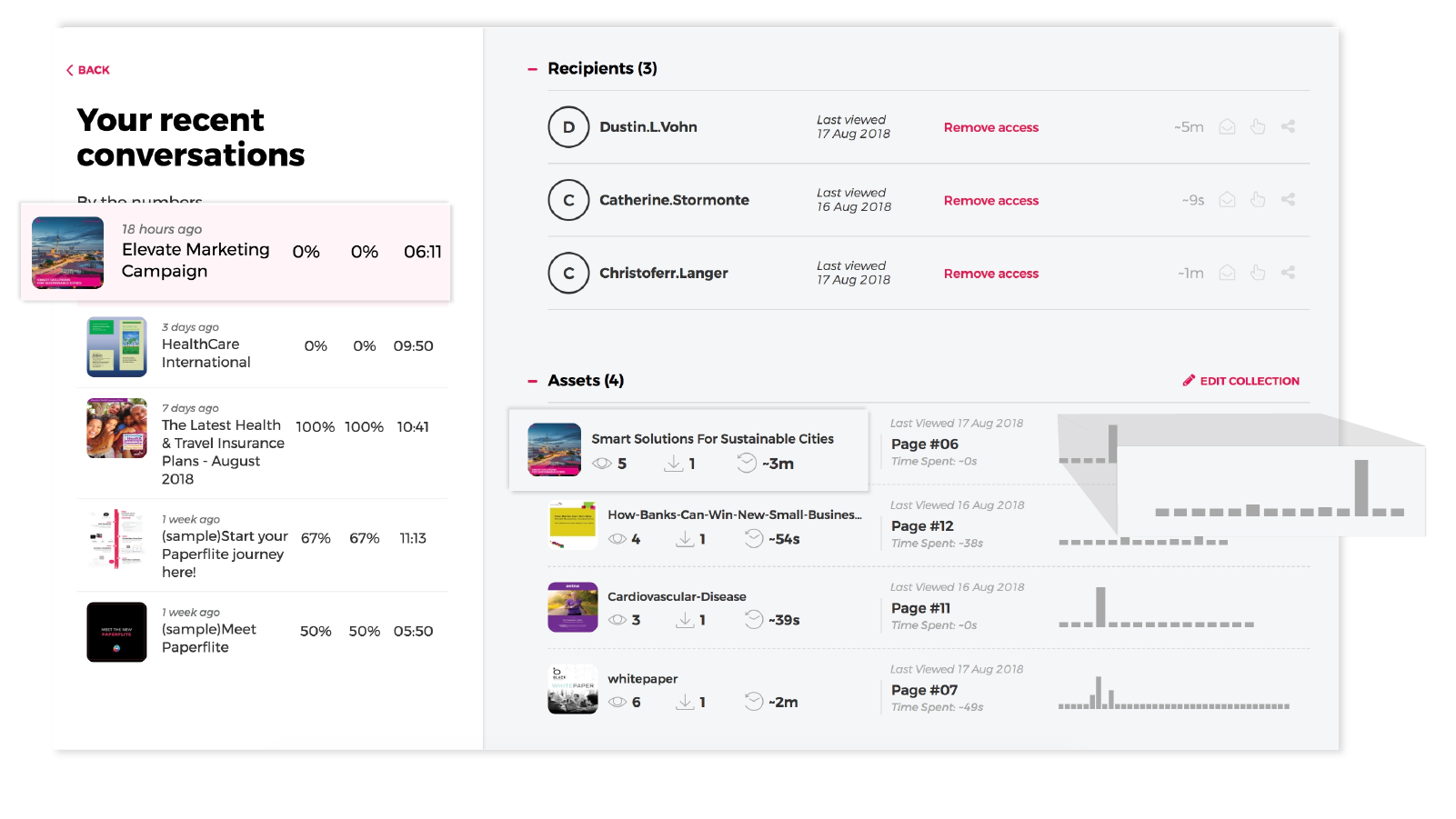 You’ll send over 5-6 emails with different content pieces before you close a sale. Imagine making your prospect dig through their inbox to fetch your earlier conversations or worse if they’ve deleted it. Paperflite lets your prospect view all the content in conversations you’ve ever shared in just a single click.